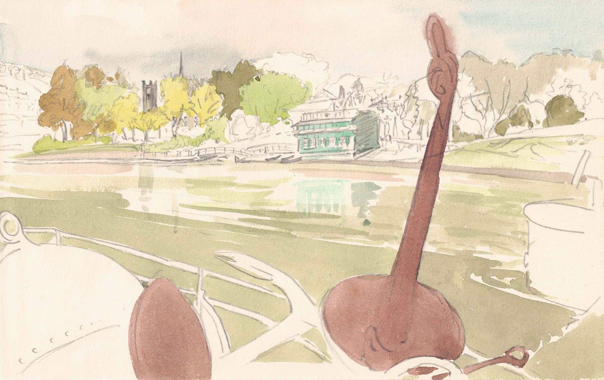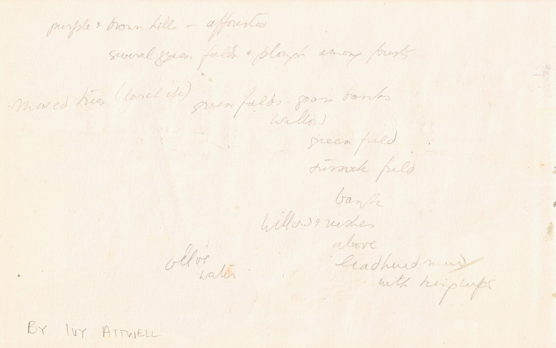This watercolour depicts Abbey Church in Kilculliheen, on the north bank of the River Suir, across from the city of Waterford. On the verso there are a number of notes written by the artist, recording the blends of paint colour used.