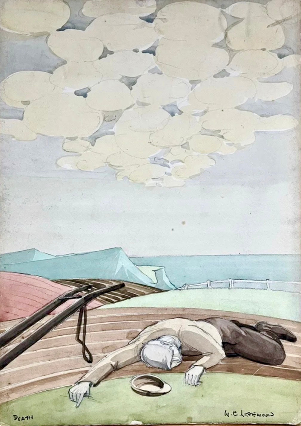 Likely dating to the 1930s, this watercolour by William Littlewood - simply titled ‘Death’ - aptly captures the artist’s interpretation of human life. A farmer, dying whilst trying to exert his control over Earth, lies as a grey form. The clouds form a vanishing point, directing the eye of the viewer towards the distant sky, and the eventuality it provides.