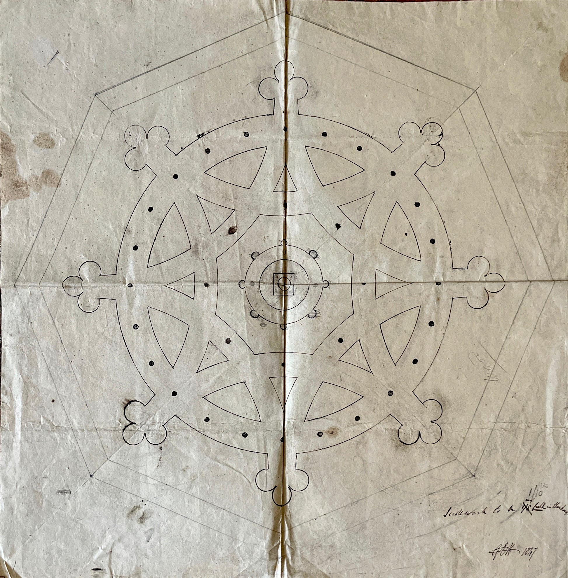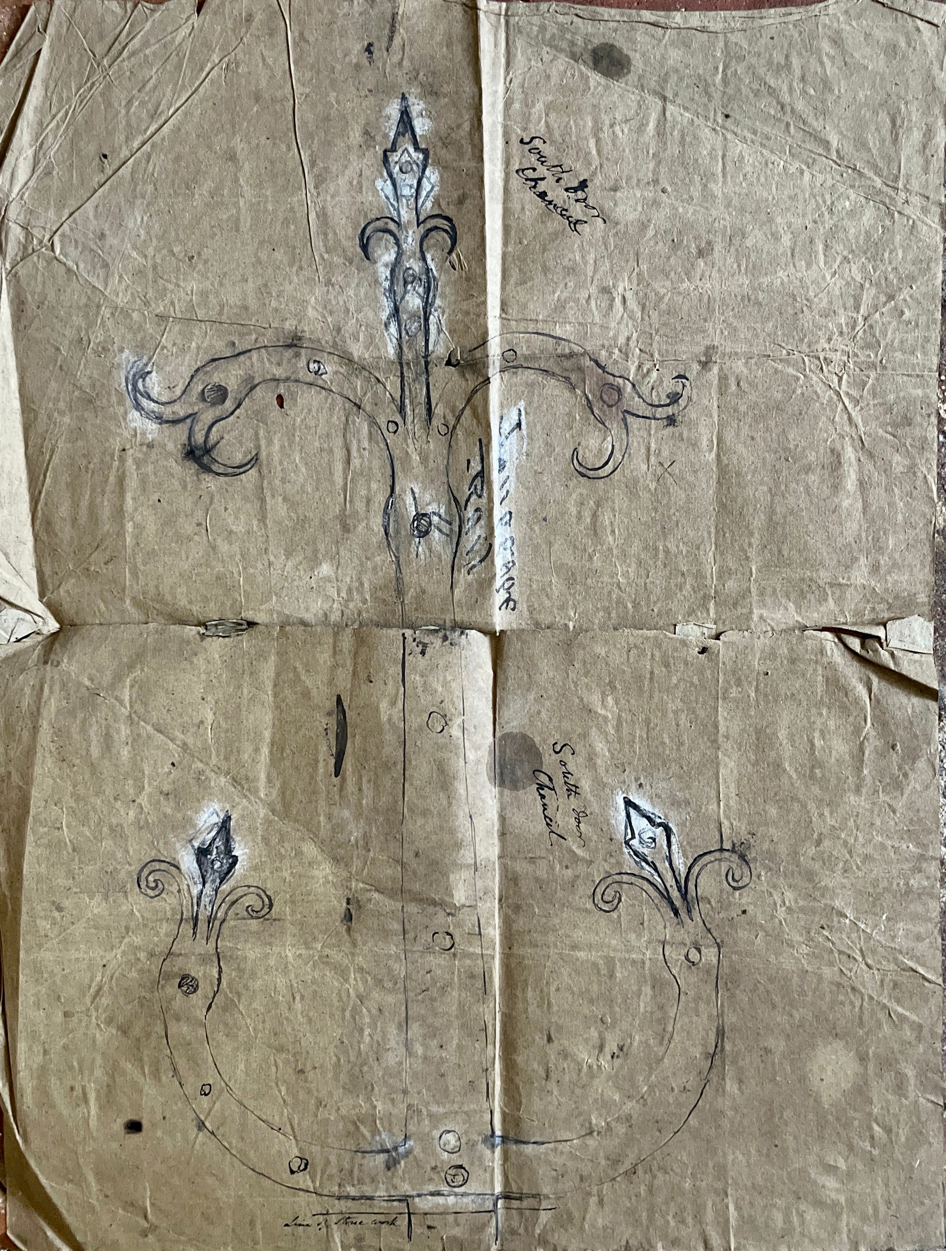 The main work is signed and dated by the artist on the lower right of the design. Alongside the design for the font cover are two other designs - one for a processional cross, and one for a door hinge. All the designs are drawn at a 1:1 scale.