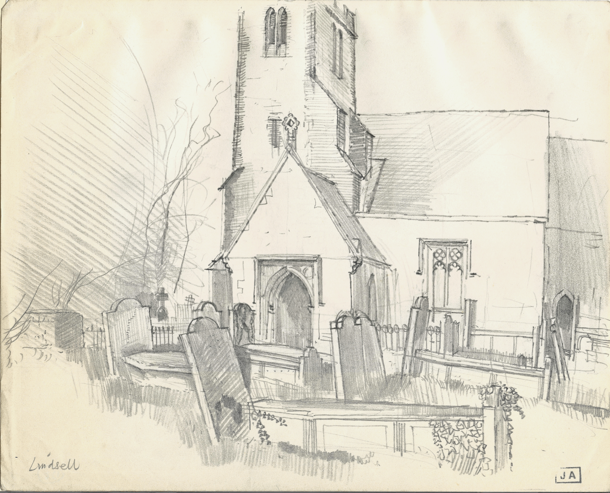 John Aldridge. Pencil on paper. Titled on lower left of image, with initial stamped on lower right. Within single mount.