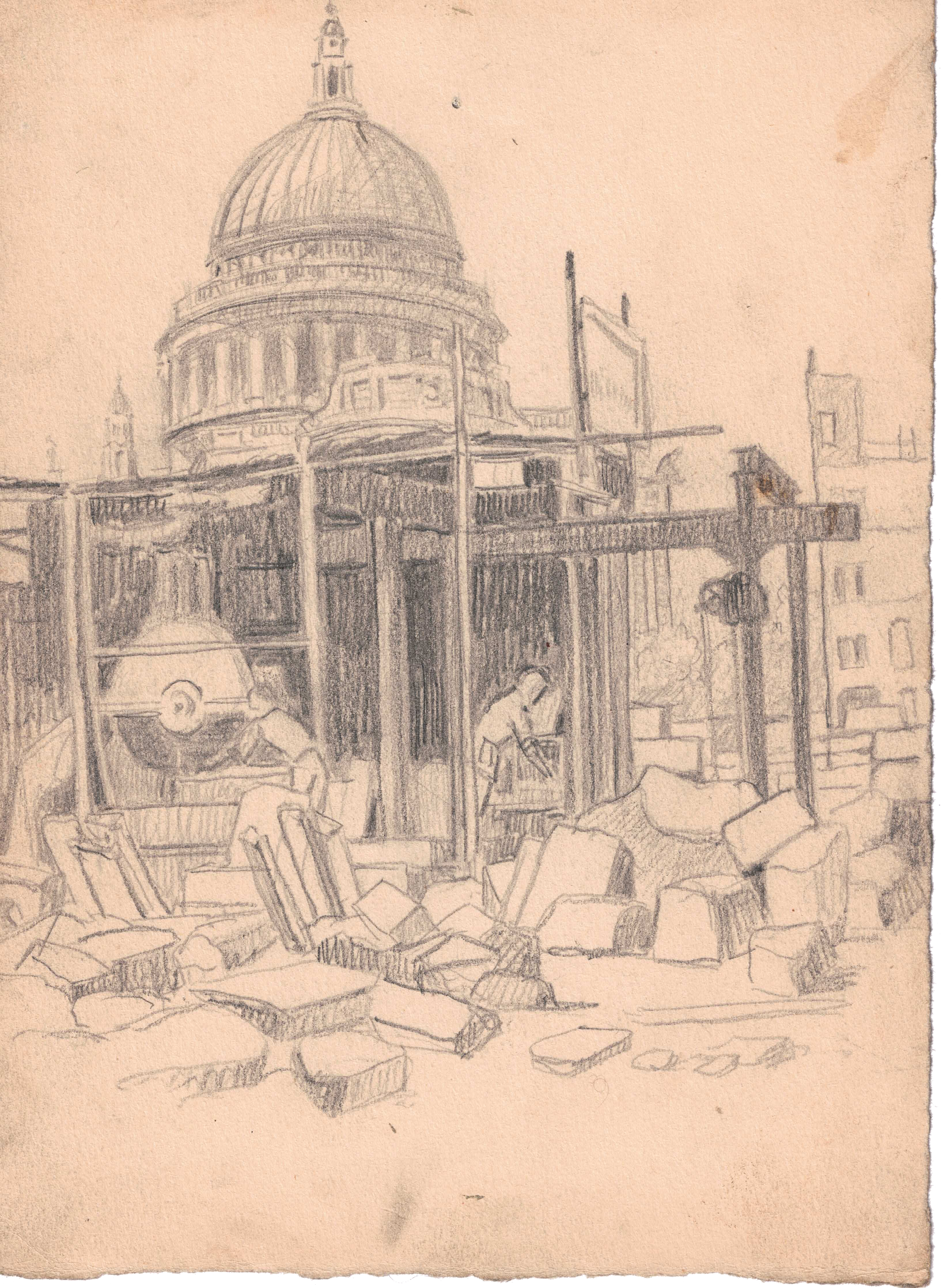 St Paul’s Cathedral holds a central position in the mythos of the Blitz. Its smoking visage made famous by Herbert Mason’s St Paul’s Survives (1940) is a key symbol of the damage that the Blitz brought to London. The off-centre positioning of the cathedral and the observational style of the sketch, however, places an emphasis on the ongoing act of rebuilding and reconstruction, rather than the enduring presence of Wren’s form within the London skyline.